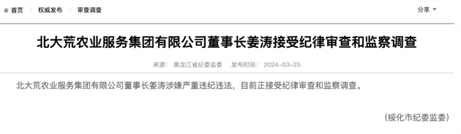3月25日,黑龍江省紀(jì)委監(jiān)委網(wǎng)站發(fā)布消息,北大荒農(nóng)業(yè)服務(wù)集團(tuán)有限公司董事長(zhǎng)姜濤涉嫌嚴(yán)重違紀(jì)違法,目前正接受紀(jì)律審查和監(jiān)察調(diào)查。