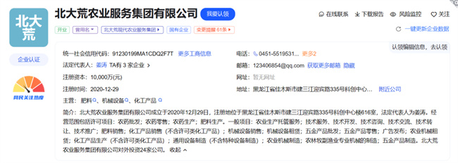 公開信息顯示,北大荒農(nóng)業(yè)服務(wù)集團(tuán)有限公司法人為姜濤,注冊(cè)資本1億元,公司經(jīng)營(yíng)范圍包括農(nóng)藥批發(fā)、農(nóng)藥零售、農(nóng)藥生產(chǎn)、肥料生產(chǎn)等。