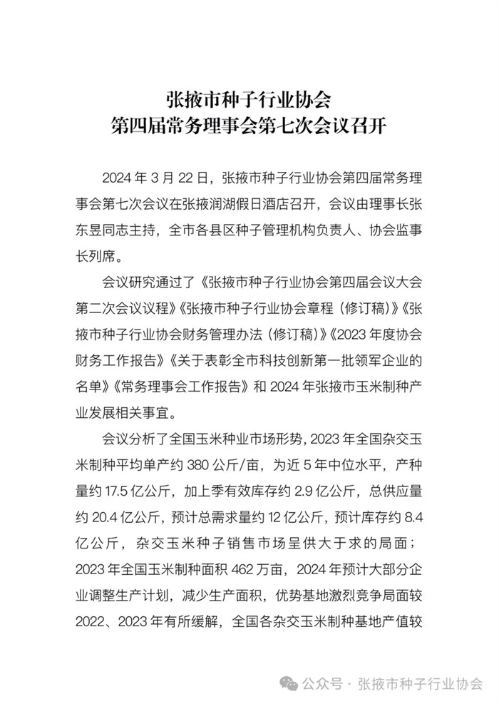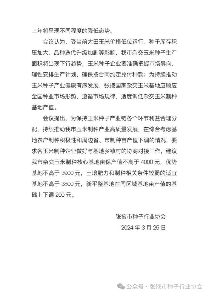 3月22日,張掖市種子行業(yè)協(xié)會(huì)第四屆常務(wù)理事會(huì)第七次會(huì)議上提出:為保持玉米種子產(chǎn)業(yè)鏈各個(gè)環(huán)節(jié)利益合理分配,持續(xù)推動(dòng)我市玉米制種產(chǎn)業(yè)高質(zhì)量發(fā)展,在綜合考慮基地農(nóng)戶制種積極性和周邊省、市制種畝產(chǎn)值下調(diào)的情況,要求各玉米制種企業(yè)做好與基地鄉(xiāng)鎮(zhèn)村的協(xié)商對(duì)接工作,建議我市雜交玉米制種核心基地畝保產(chǎn)值不高于4000元,優(yōu)勢(shì)基地不高于3900元,土壤肥力和制種相關(guān)條件較弱的適宜基地不高于3800元,新平整基地在同區(qū)域基地畝產(chǎn)值的基礎(chǔ)上下調(diào)200元。