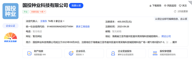 早在2023年9月26日,央企“國(guó)家隊(duì)”國(guó)家開(kāi)發(fā)投資集團(tuán)有限公司(簡(jiǎn)稱“國(guó)投集團(tuán)”)便在海南三亞布下一子——國(guó)投種業(yè)科技有限公司(簡(jiǎn)稱“國(guó)投種業(yè)”)在崖州灣科技城完成注冊(cè)。