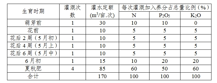 (3)畝產(chǎn)3000—4000公斤果園:氮肥(N)全年用量17.5—22.5公斤/畝、春季用量5—6.5公斤/畝,磷肥(P2O5)全年用量9—11.5公斤/畝、春季用量3.5—4.5公斤/畝,鉀肥(K2O)全年用量19.5—25公斤/畝、春季用量4—5公斤/畝。