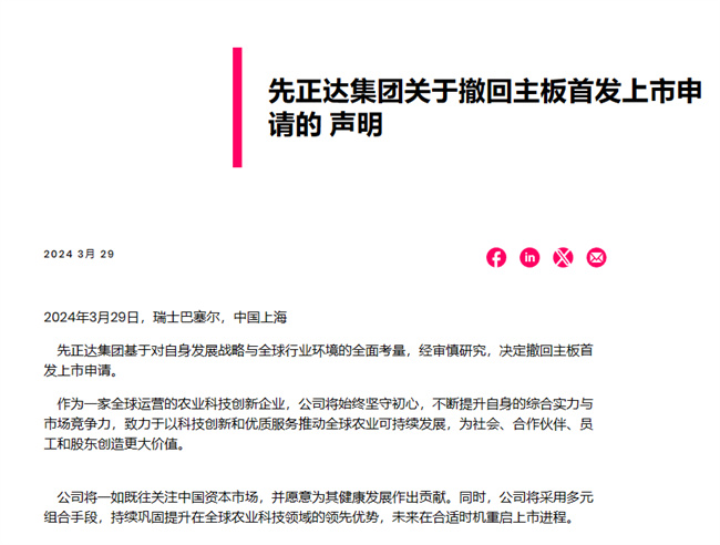對于IPO終止,3月29日,先正達集團在公司網(wǎng)站發(fā)布聲明稱,先正達集團基于對自身發(fā)展戰(zhàn)略與全球行業(yè)環(huán)境的全面考量,經(jīng)審慎研究,決定撤回主板首發(fā)上市申請。
