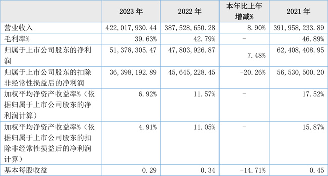 綠亨科技3月29日披露2023年年報(bào)。2023年,公司實(shí)現(xiàn)營業(yè)總收入4.22億元,同比增長8.90%;歸母凈利潤5137.83萬元,同比增長7.48%;扣非凈利潤3639.82萬元,同比下降20.26%;經(jīng)營活動(dòng)產(chǎn)生的現(xiàn)金流量凈額為9658.39萬元,同比增長48.85%;報(bào)告期內(nèi),綠亨科技基本每股收益為0.29元,加權(quán)平均凈資產(chǎn)收益率為6.92%。