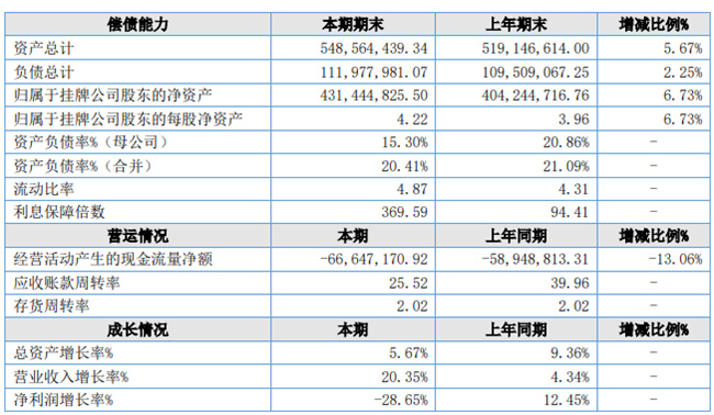 截止2023年末,公司總資產(chǎn)5.49億元,較期初增長 5.67%,歸屬于掛牌公司股東的凈資產(chǎn)為 4.31億元,較期初增長 6.73%。