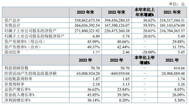 日前,湖北康農(nóng)種業(yè)股份有限公司發(fā)布 2023 年度報(bào)告。2023 年,公司實(shí)現(xiàn)營業(yè)收入2.88億元,同比增長45.85%,實(shí)現(xiàn)歸母凈利潤5322萬元,同比增長28.73%,實(shí)現(xiàn)經(jīng)營活動(dòng)產(chǎn)生的現(xiàn)金流量凈額6501萬元,同比轉(zhuǎn)正,資產(chǎn)負(fù)債率為49.37%,同比上升6.93個(gè)百分點(diǎn)。2023 年末,公司總資產(chǎn)為 5.39 億元,較年初增長 36.62%,歸屬于上市公司股東的所有者權(quán)益為 2.72 億元,較年初增長 20.01%。