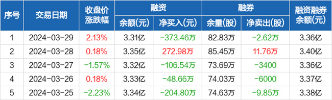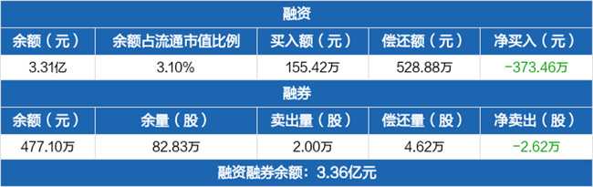 融資方面,當(dāng)日融資買入155.42萬元,融資償還528.88萬元,融資凈償還373.46萬元。融券方面,融券賣出2萬股,融券償還4.62萬股,融券余量82.83萬股,融券余額477.1萬元。融資融券余額合計(jì)3.36億元。