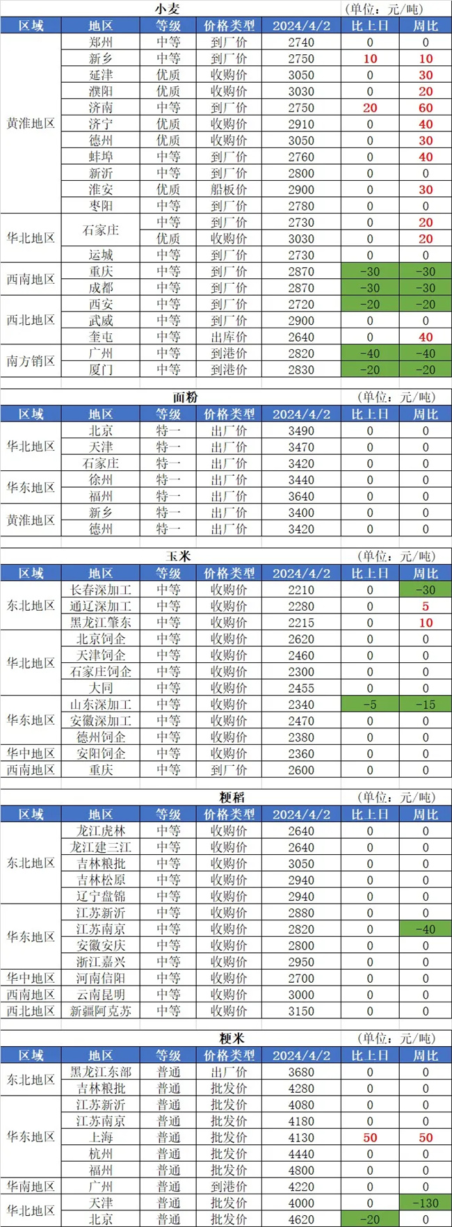 2、4月2日國(guó)內(nèi)玉米價(jià)格偏弱調(diào)整,其中:南方銷(xiāo)區(qū)、南北港口玉米價(jià)格基本穩(wěn)定;東北地區(qū)、華北地區(qū)玉米價(jià)格基本穩(wěn)定,局部?jī)r(jià)格小幅下跌,跌幅10-40元/噸。