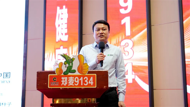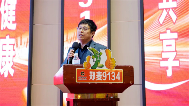 國家生物育種產(chǎn)業(yè)創(chuàng)新中心許為鋼院士團(tuán)隊成員董海濱就鄭麥9134的高產(chǎn)、廣適、抗寒好、高抗倒、綜合抗病性強(qiáng)、品質(zhì)優(yōu)等六大優(yōu)點進(jìn)行詳細(xì)介紹,并分享了鄭麥9134提單產(chǎn)配套栽培管理技術(shù)。
