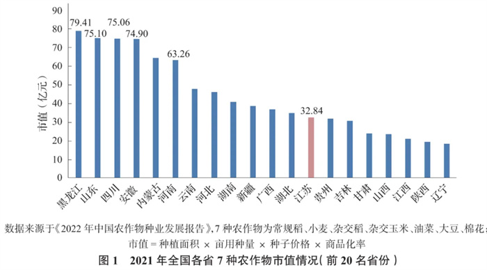 江蘇種業(yè)產(chǎn)業(yè)規(guī)模不大。一方面,省內(nèi)市場體量較小,耕地面積少,遠(yuǎn)低于黑龍江、河南等農(nóng)業(yè)大省,且主要作物常規(guī)稻麥的市場價(jià)值、商品化率均不高。據(jù)統(tǒng)計(jì),2021年江蘇省7種主要農(nóng)作物市值32.84億元(圖1),僅排全國第13位,不足黑龍江(排第1位)市值的一半。另一方面,“走出去”開拓省外、國際市場嚴(yán)重不足,80%以上的持證種子企業(yè)生產(chǎn)經(jīng)營僅限于省內(nèi)市場,龍頭企業(yè)中僅少數(shù)在省外設(shè)立子公司,但經(jīng)營重心仍偏重于省內(nèi);少數(shù)主營雜交稻種子的企業(yè)嘗試探索東南亞種子市場,但規(guī)模和效益并不顯著。