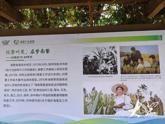 位于三亞崖州區(qū)的國家現(xiàn)代農(nóng)業(yè)(種業(yè))產(chǎn)業(yè)園內(nèi),宣傳展板上張貼著李登海當年來南繁的工作照。