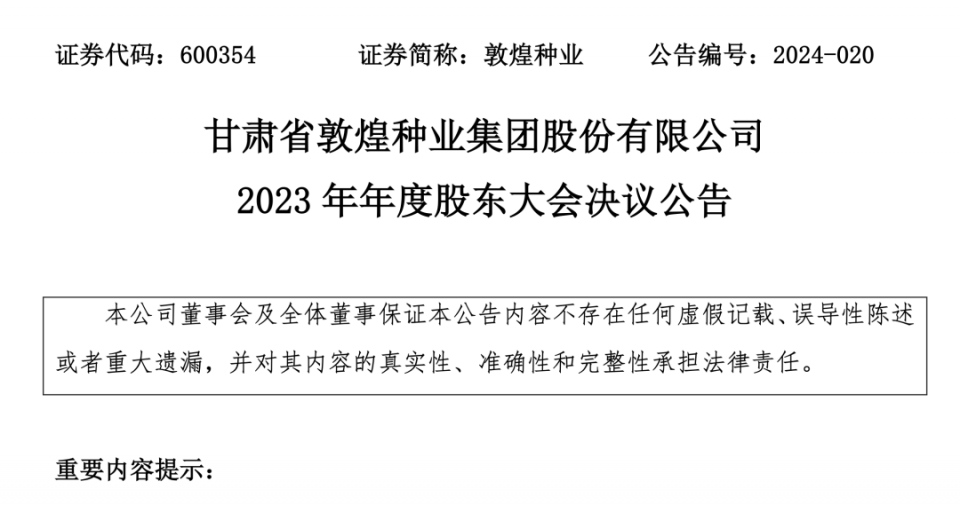4月13日,甘肅省敦煌種業(yè)集團(tuán)股份有限公司發(fā)布2023年年度股東大會決議公告,審議通過為酒泉敦煌種業(yè)百佳食品有限公司貸款擔(dān)保6,000萬元,為瓜州敦種棉業(yè)有限公司貸款擔(dān)保4,000萬元,為甘肅省敦煌種業(yè)集團(tuán)金昌金從玉農(nóng)業(yè)科技有限公司貸款1,000萬元提供反擔(dān)保。