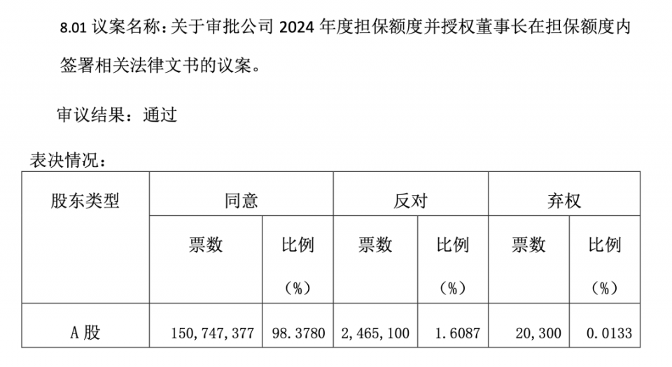 同時本次股東大會審議批準(zhǔn)在貸款擔(dān)保額度范圍內(nèi),授權(quán)董事長在2023 年年度股東大會通過本議案至 2024 年年度股東大會召開之日內(nèi),簽署與銀行等金融機(jī)構(gòu)所簽訂的《擔(dān)保合同》《保證合同》《抵押合同》等法律文書。