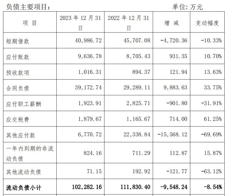 2023 年度財務(wù)決算報告顯示,報告期末,負(fù)債 114,496.80 萬元,比報告期初 121,706.63 萬元,減少 7,209.83 萬元。受公司主導(dǎo)產(chǎn)品良好的市場競爭力及與客戶較強(qiáng)議價能力影響,合同負(fù)債占到負(fù)債總額的 34.21%,較上年同期增加 10.14%。