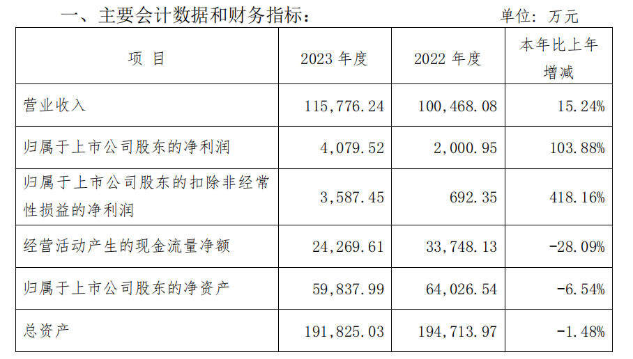 2023 年度財務(wù)決算報告顯示,2023年度,全公司實現(xiàn)營業(yè)收入115,776.24 萬元,比上年同期增加 15,308.16 萬元,增幅 15.24%;發(fā)生營業(yè)成本 83,598.91 萬元,比上年同期增加 7,661.39 萬元,增幅 10.09%;實現(xiàn)銷售毛利32,177.33 萬元,比上年同期增加 7,646.77 萬元,毛利率由上年24.42%增至 27.79%,增幅 3.37 個百分點;全年實現(xiàn)凈利潤 9,762.47 萬元,較上年增加3,402.29 萬元;其中:歸屬于母公司股東的凈利潤 4,079.52 萬元,較上年增加 2,078.57 萬元。