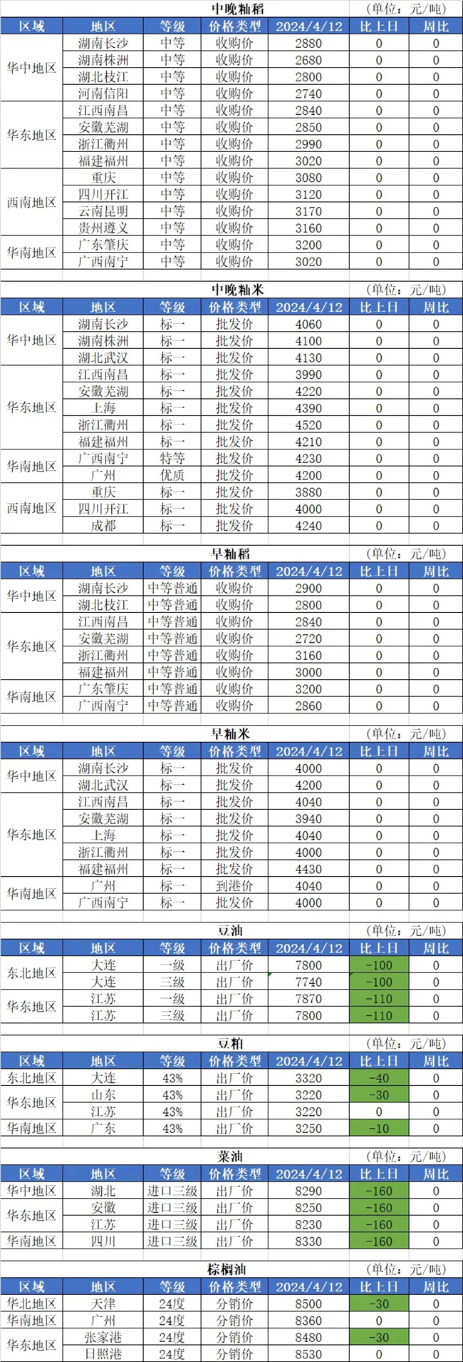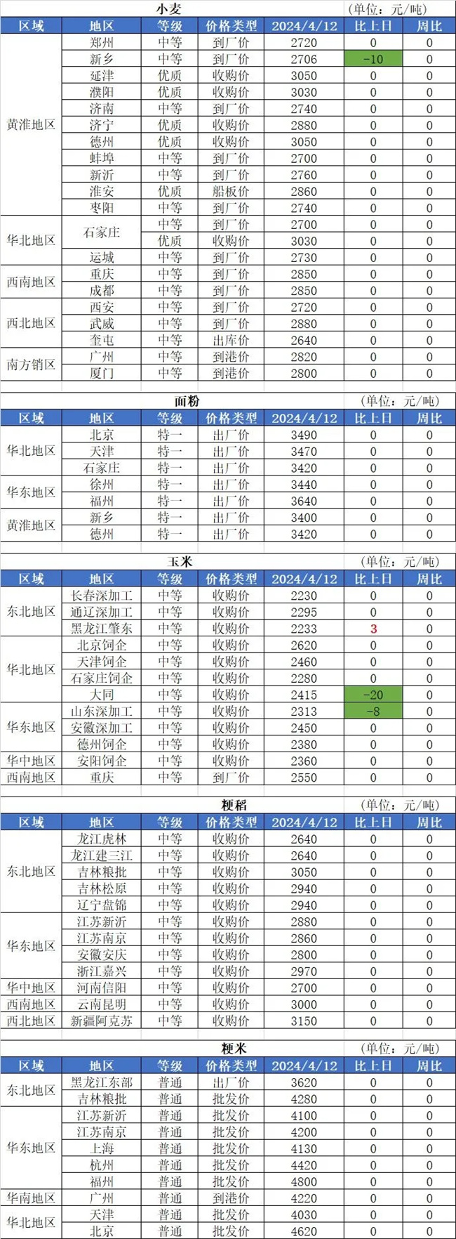 2、4月12日國內(nèi)玉米價(jià)格小幅走弱,其中:南北港口、南方銷區(qū)玉米價(jià)格基本穩(wěn)定;華北地區(qū)玉米價(jià)格基本穩(wěn)定,局部價(jià)格下跌,跌幅5-20元/噸;東北地區(qū)玉米價(jià)格基本穩(wěn)定,局部價(jià)格略有波動(dòng),波動(dòng)幅度10元/噸。