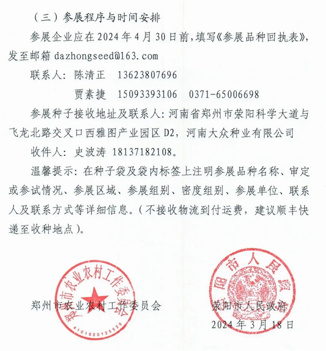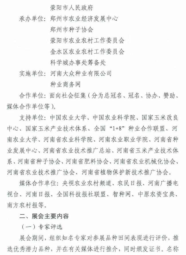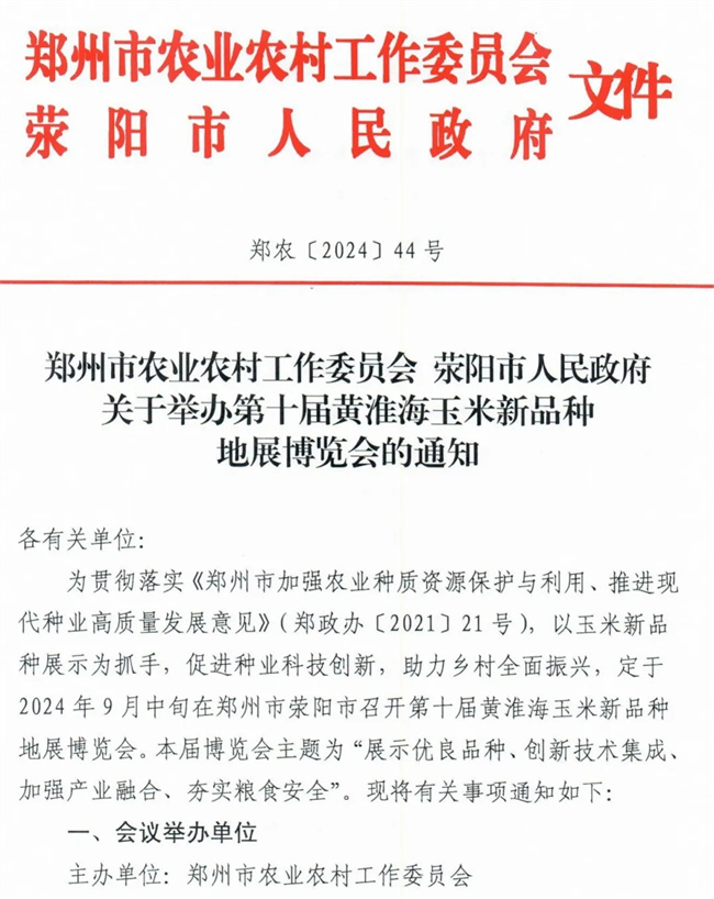 為貫徹落實《鄭州市加強農(nóng)業(yè)種質(zhì)資源保護與利用、推進現(xiàn)代種業(yè)高質(zhì)量發(fā)展意見》(鄭政辦〔2021〕21號),以玉米新品種展示為抓手,促進種業(yè)科技創(chuàng)新,助力鄉(xiāng)村全面振興,定于2024年9月中旬在鄭州市滎陽市召開第十屆黃淮海玉米新品種地展博覽會。本屆博覽會主題為“展示優(yōu)良品種、創(chuàng)新技術(shù)集成、加強產(chǎn)業(yè)融合、夯實糧食安全”?,F(xiàn)將有關(guān)事項通知如下: