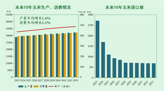 未來10年,玉米播種面積保持穩(wěn)定,預(yù)計(jì)2033年為66366萬畝(4424萬公頃);隨著農(nóng)業(yè)基礎(chǔ)設(shè)施的持續(xù)完善,良田、良種、良法、良機(jī)、良制的集成推廣,預(yù)計(jì)單產(chǎn)水平持續(xù)提高。展望期末將達(dá)到486千克/畝,年均增長1.3%;產(chǎn)量將穩(wěn)步增長至3.23億噸,年均增長1.4%。玉米消費(fèi)量穩(wěn)中有增,預(yù)計(jì)2033年消費(fèi)量將達(dá)3.21億噸,年均增長1.1%。進(jìn)口量持續(xù)下降,預(yù)計(jì)2033年將減至680萬噸。