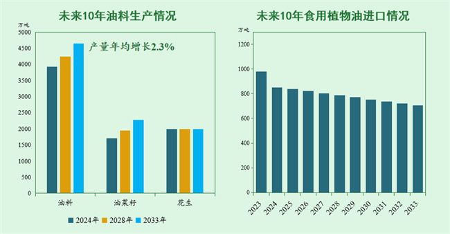 未來10年,良種良法配套、農(nóng)機(jī)農(nóng)藝融合等生產(chǎn)技術(shù)集成推廣應(yīng)用,帶動單產(chǎn)穩(wěn)步提升,油料產(chǎn)量將持續(xù)增長。預(yù)計(jì)2033年油料產(chǎn)量將達(dá)到4639萬噸,年均增長2.3%。受人口總量減少、經(jīng)濟(jì)增長和城鎮(zhèn)化速度趨緩、人均食用植物油消費(fèi)量接近飽和等因素影響,居民食用植物油消費(fèi)量增速將繼續(xù)放緩、結(jié)構(gòu)進(jìn)一步優(yōu)化。預(yù)計(jì)2033年食用植物油消費(fèi)量將達(dá)3702萬噸,年均增長0.11%,明顯低于過去10年2.6%的年均增長水平;居民食用消費(fèi)緩慢下降,年均下降0.14%。未來10年,中國將繼續(xù)利用國際市場來滿足和優(yōu)化國丙食用植物油供應(yīng),但油籽和食用植物油進(jìn)口量下降。