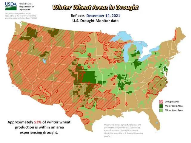2021年12月,美國農(nóng)業(yè)部曾發(fā)布一份小麥生產(chǎn)的干旱監(jiān)測數(shù)據(jù),數(shù)據(jù)顯示約有53%的冬小麥產(chǎn)區(qū)正在經(jīng)歷干旱。到2022年3月,干旱區(qū)的面積進一步增加到了70%左右,這意味著美國最重要的小麥品種正在遭遇缺水危機,平均畝產(chǎn)很可能會下調(diào)縮水。