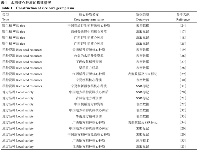 構(gòu)建核心種質(zhì)是提高水稻種質(zhì)資源利用效率以及提升種質(zhì)創(chuàng)新能力的前提與基礎(chǔ)。目前已構(gòu)建了野生稻、地方稻種資源和地方品種的核心種質(zhì)。在野生稻方面,陳雨以217份廣東高州普通野生稻為基礎(chǔ)材料,構(gòu)建了一套包含24份野生稻的核心種質(zhì);薛艷霞等以623份廣西普通野生稻為基礎(chǔ)材料,構(gòu)建了一套包含31份野生稻的核心種質(zhì)。地方稻種資源方面,李自超等以50526份中國(guó)地方稻種資源為基礎(chǔ)材料,構(gòu)建了一套初級(jí)核心種質(zhì),該核心種質(zhì)包含4310份地方種質(zhì)資源;Zhang等以4310份初級(jí)核心種質(zhì)為基礎(chǔ)材料,構(gòu)建了一套包含932份的水稻核心種質(zhì);孫強(qiáng)等以3170份遺傳穩(wěn)定材料為基礎(chǔ)材料,構(gòu)建了一套包含477份的水稻核心種質(zhì)。在地方品種方面,魏興華等以16791份中國(guó)粳稻地方種為基礎(chǔ)材料,構(gòu)建了一套5%樣品集的核心種質(zhì);黎毛毛等以3187份江西省現(xiàn)代地方稻種資源為基礎(chǔ)材料,構(gòu)建了一套包含296份的水稻核心種質(zhì)。據(jù)統(tǒng)計(jì),目前中國(guó)已經(jīng)構(gòu)建了21套水稻核心種質(zhì)(表1),其中野生稻4套,稻種資源7套,地方品種10套。這些核心種質(zhì)的構(gòu)建為今后生物育種提供基礎(chǔ)材料,為未來(lái)重要基因的合理布局提供遺傳材料及科學(xué)依據(jù)。