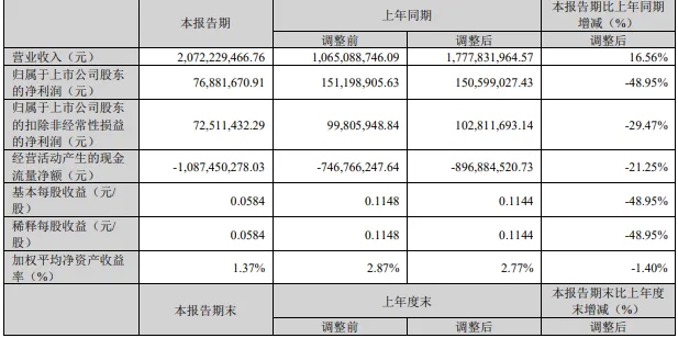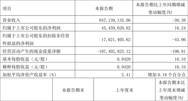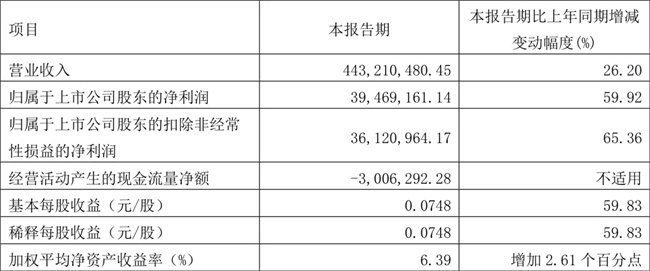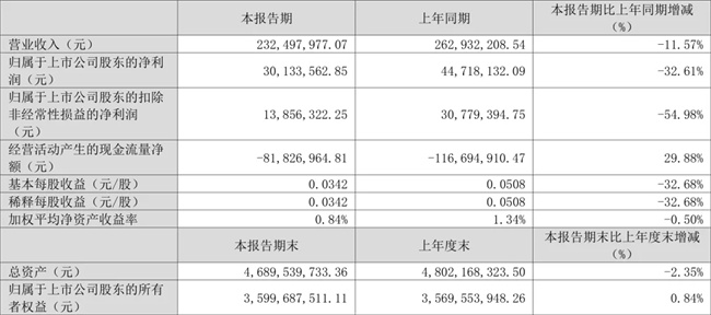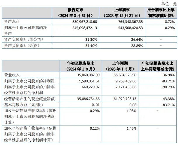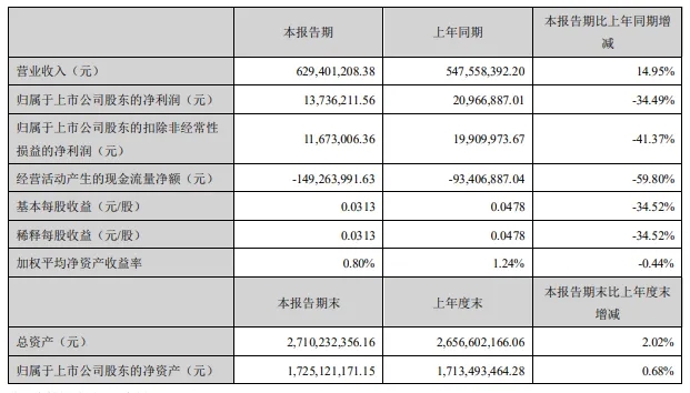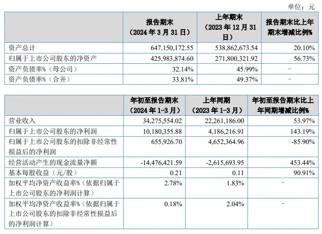 同日披露的2024年一季報(bào)顯示,2024年第一季度公司實(shí)現(xiàn)營業(yè)總收入2.07億元,同比增長16.56%;歸母凈利潤7688.17萬元,同比下降48.95%;扣非凈利潤7251.14萬元,同比下降29.47%。