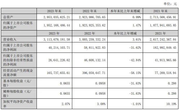 豐樂種業(yè)(000713)4月26日披露2023年年報(bào)。2023年,公司實(shí)現(xiàn)營業(yè)總收入31.14億元,同比增長3.61%;歸母凈利潤4021.41萬元,同比下降31.62%;扣非凈利潤2664.12萬元,同比下降42.84%;經(jīng)營活動(dòng)產(chǎn)生的現(xiàn)金流量凈額為1.66億元,同比下降58.15%。