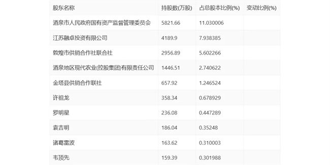 一季報(bào)顯示,2024年一季度末公司十大流通股東中,新進(jìn)股東為酒泉市人民政府國有資產(chǎn)監(jiān)督管理委員會(huì)、許祖龍、韋頂先,取代了上年末的酒泉市農(nóng)業(yè)科學(xué)研究院、胡志斌、中信證券股份有限公司。在具體持股比例上,酒泉地區(qū)現(xiàn)代農(nóng)業(yè)(控股集團(tuán))有限責(zé)任公司持股有所下降。