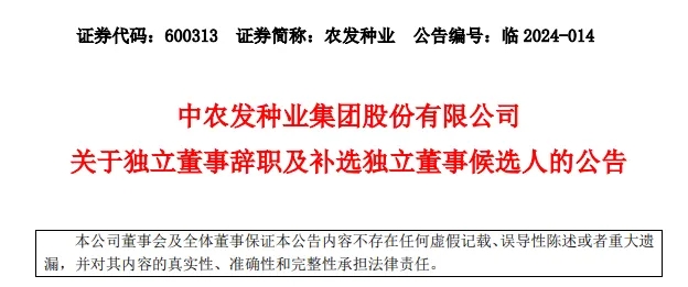 農(nóng)發(fā)種業(yè):獨(dú)立董事王一鳴和周建如申請辭職,韓一軍和楊鵬被提名為新的獨(dú)立董事候選人