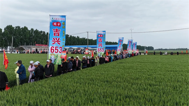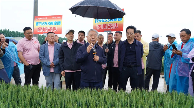 吉興653田間觀摩現(xiàn)場(chǎng),河南農(nóng)業(yè)大學(xué)國(guó)家小麥工程技術(shù)研究中心教授、博士生導(dǎo)師、農(nóng)業(yè)農(nóng)村部小麥專家指導(dǎo)組顧問(wèn)郭天財(cái)教授高度稱贊吉興653既成穗高又穗子大,抗性又好,我3年來(lái)關(guān)注該品種均表現(xiàn)不錯(cuò),是一個(gè)穩(wěn)產(chǎn)高產(chǎn)的好品種,對(duì)這樣的品種希望廣大經(jīng)銷商要大力推廣,盡快上量上面積,讓農(nóng)民朋友用上好種子多打糧。同時(shí),當(dāng)前,小麥已進(jìn)入灌漿期,是最終經(jīng)濟(jì)產(chǎn)量的形成期,也是預(yù)防旱、澇、風(fēng)、病蟲(chóng)、倒伏等自然災(zāi)害的關(guān)鍵時(shí)期。希望大家做好小麥中后期管理,爭(zhēng)取糧食增產(chǎn)增收再上一個(gè)新臺(tái)階;懷川種業(yè)副總經(jīng)理梁紅衛(wèi)重點(diǎn)介紹小麥原種生產(chǎn)流程和確保高質(zhì)量種子的關(guān)鍵措施,不光生產(chǎn)的品種好,還得質(zhì)量好,讓大家銷售放心,售后安心。