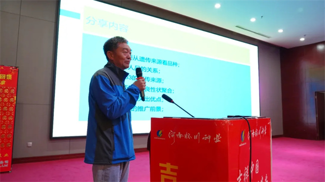 河南省種業(yè)發(fā)展中心原實(shí)驗(yàn)科科長(zhǎng)鄧士政博士就吉興653種質(zhì)資源背景優(yōu)勢(shì)和利用吉興653親本優(yōu)勢(shì)及育種目標(biāo)的實(shí)現(xiàn)深入淺出的進(jìn)行了分析,對(duì)兼容親本優(yōu)勢(shì),實(shí)現(xiàn)超越突破,從而選育出高產(chǎn)穩(wěn)產(chǎn)、高抗逆性和廣適性等優(yōu)勢(shì)性狀的吉興653,從育種機(jī)理上給予了充分肯定,稱吉興653是努力和機(jī)遇兩者結(jié)合而誕生的好品種,難能可貴,不可多得。