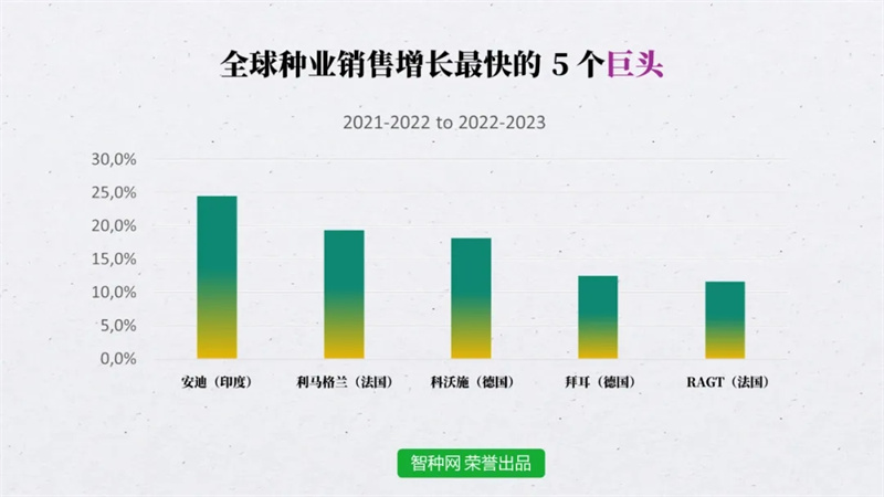 在上述排名前 12 位的種子公司中,以下是根據(jù)增長率對育種公司進行的排名: