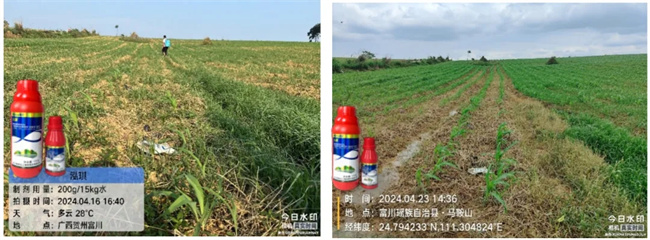 如果施藥時雜草出苗不全,后期雜草再次發(fā)生,可間隔15天左右二次施用。如遇雜草發(fā)生期長期干旱或葉片塵土覆蓋較多,建議盡量雨后施藥或適當增加用藥量。