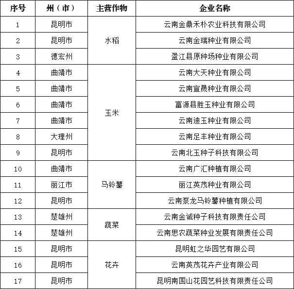 根據(jù)企業(yè)資產(chǎn)實(shí)力、育種研發(fā)、創(chuàng)新成果、市場(chǎng)規(guī)模等情況,決定遴選云南金鼎禾樸農(nóng)業(yè)科技有限公司等17家企業(yè)為省級(jí)農(nóng)作物種業(yè)陣型企業(yè);曲靖溫氏種豬科技有限公司等15家企業(yè)為省級(jí)畜禽種業(yè)陣型企業(yè);西雙版納云博水產(chǎn)養(yǎng)殖開(kāi)發(fā)有限公司等10家企業(yè)為省級(jí)水產(chǎn)種業(yè)陣型企業(yè)。