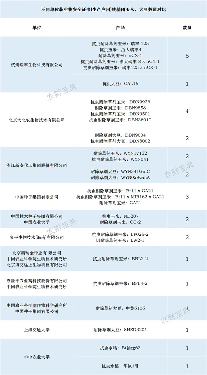 擁有轉(zhuǎn)化體數(shù)量較多的均為企業(yè):大北農(nóng)、杭州瑞豐各6個,新安化工4個,中國種子集團(tuán)3個。2024年5月8日發(fā)布的最新批準(zhǔn)清單中,奧瑞金種業(yè)首次獲得一個抗蟲耐除草劑玉米的安全證書。