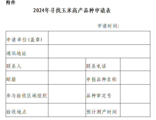 (一)申報(bào)單位填寫(xiě)《2024年尋找玉米高產(chǎn)品種申請(qǐng)表》,東華北春播區(qū)和西北區(qū)于6月20日前、黃淮海夏播區(qū)于6月30日前將申請(qǐng)表的電子版文件、蓋章后掃描文件一并發(fā)至郵箱:[email protected]。