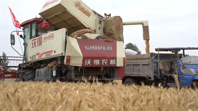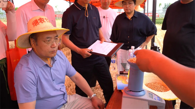“根據(jù)農(nóng)業(yè)農(nóng)村部全國糧食高產(chǎn)創(chuàng)建文件驗收辦法的有關(guān)規(guī)定,專家組實(shí)地查看了小麥的田間長勢,在聽取有關(guān)情況介紹的基礎(chǔ)上,經(jīng)過面積丈量,采取聯(lián)合收割機(jī)連片實(shí)打?qū)嵤?,收割前進(jìn)行全面清倉檢查,田間落粒不計入產(chǎn)量,稱重取樣測定水分雜質(zhì)粒率去除等環(huán)節(jié),驗收結(jié)果如下:整塊地長勢良好,地塊長150米,寬17.675米,面積3.98畝,共收獲鮮籽粒3848公斤,經(jīng)過水分測定儀5點(diǎn)取樣,平均含水率21.08%,雜質(zhì)率1%,按照入庫13%的標(biāo)準(zhǔn)含水量,折合畝產(chǎn)868公斤。”專家組現(xiàn)場公布實(shí)打測產(chǎn)結(jié)果。