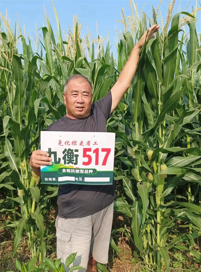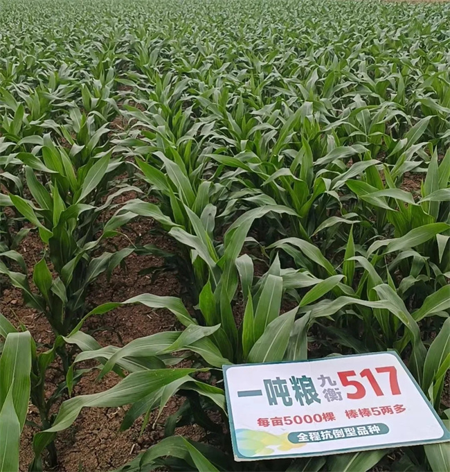 九衡517,2020年通過國家審定,株型半緊湊,株高243厘米,穗位高78厘米,免化控;莖稈粗壯韌性好,根系發(fā)達(dá),抗倒能力強(qiáng);早熟、宜機(jī)收、產(chǎn)量高、適應(yīng)性廣等優(yōu)點,生育期100天左右,較對照品種鄭單958早熟3天左右;耐密植,產(chǎn)量高,中高肥力地塊4500—5000株/畝;綜合抗病性好,接種鑒定:中抗小斑病、穗腐病,感莖腐病、彎孢葉斑病、南方銹??;籽粒脫水快,機(jī)械化粒收損失率低。特別在近年來復(fù)雜多變氣候和病蟲害頻發(fā)、重發(fā)的條件下,九衡517抗高溫結(jié)實、抗青枯和穗腐病等方面的優(yōu)秀表現(xiàn),得到種植戶的一致好評和經(jīng)銷商的一致認(rèn)可。
