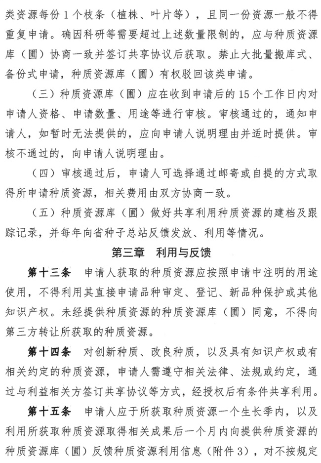 在種質(zhì)資源的利用與反饋方面,申請人不得利用獲取的種質(zhì)資源直接申請品種審定、登記、新品種保護或其他知識產(chǎn)權(quán)。未經(jīng)提供種質(zhì)資源的種質(zhì)資源庫(圃)同意,不得向第三方轉(zhuǎn)讓所獲取的種質(zhì)資源;對創(chuàng)新種質(zhì)、改良種質(zhì),以及具有知識產(chǎn)權(quán)或有相關(guān)約定的種質(zhì)資源,申請人須遵守相關(guān)法律、法規(guī)或約定,通過與利益相關(guān)方簽訂共享協(xié)議等方式,經(jīng)授權(quán)后有條件共享利用;申請人應(yīng)于所獲取種質(zhì)資源一個生長季內(nèi),以及利用所獲取種質(zhì)資源取得相關(guān)成果后一個月內(nèi)向提供種質(zhì)資源的種質(zhì)資源庫(圃)反饋種質(zhì)資源利用信息。