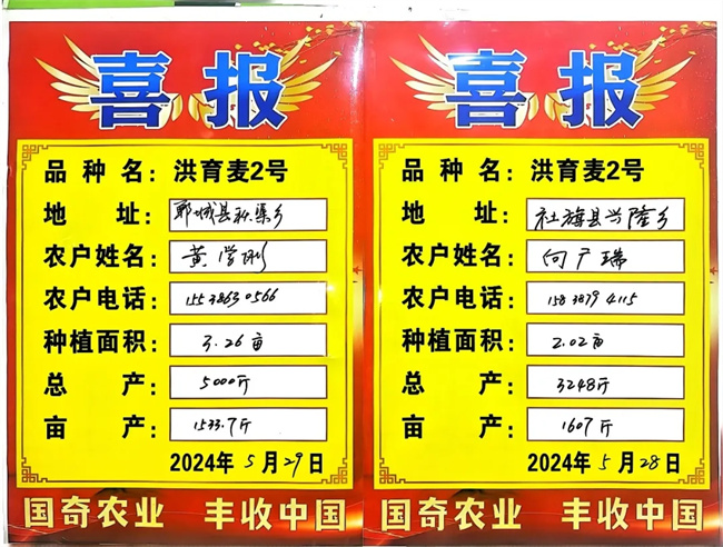 5月28日—29日,河南國奇農(nóng)業(yè)“洪育麥2號(hào)”分別在周口市國家農(nóng)高區(qū)鄲城縣和南陽市社旗縣進(jìn)行實(shí)打驗(yàn)收活動(dòng)?;顒?dòng)旨在進(jìn)一步驗(yàn)證“洪育麥2號(hào)”小麥品種高產(chǎn)穩(wěn)產(chǎn),共同見證豐收美好前景。
