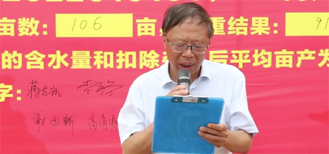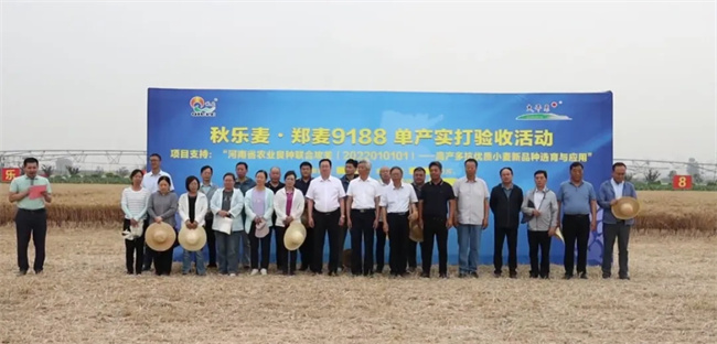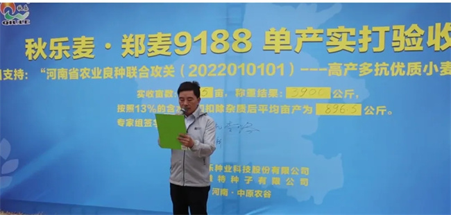 驗(yàn)收專家組按照農(nóng)業(yè)農(nóng)村部糧食作物高產(chǎn)創(chuàng)建實(shí)打驗(yàn)收有關(guān)管理辦法,分別對鄭麥9188和秋樂麥918進(jìn)行實(shí)打驗(yàn)收:鄭麥9188實(shí)收面積4.45畝,籽粒凈鮮重3900公斤,按照國家糧食入庫標(biāo)準(zhǔn)安全含水量13.0%計(jì)算,實(shí)際畝產(chǎn)為896.5公斤;秋樂麥918,實(shí)收面積10.6畝,籽粒凈鮮重9170公斤,按照國家糧食入庫標(biāo)準(zhǔn)安全含水量13.0%計(jì)算,實(shí)際畝產(chǎn)為891.35公斤。
