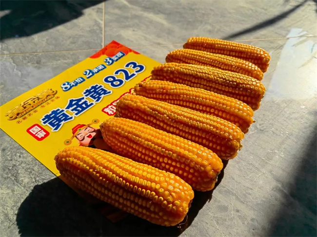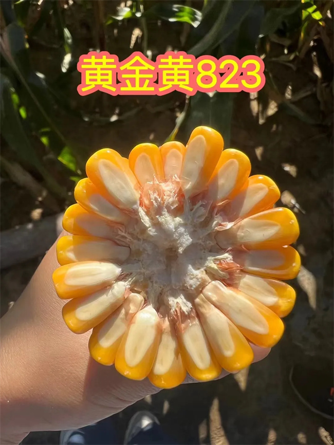 (2)穗粗穗勻結(jié)實(shí)好。穗行數(shù)18-22行,穗軸紅色,百粒重31.2克。在近年來(lái)的高溫?zé)岷?、陰雨寡照等惡劣?zāi)害氣候,黃金黃禹堃823多年多地表現(xiàn)出良好的結(jié)實(shí)性,籽粒飽滿,色澤鮮亮。