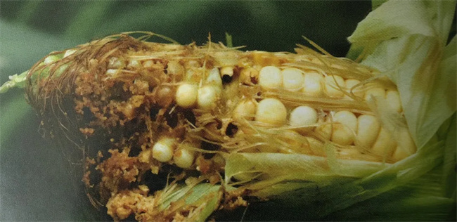 幼蟲(chóng)孵化后,一部分潛藏在雌穗著生節(jié)以上各葉片的葉腋間,取食積存的花粉和葉腋組織,至4齡后蛀莖為害;絕大部分初孵幼蟲(chóng)集中到雌穗頂端的花絲基部取食為害。生活在雌穗頂端的幼蟲(chóng)取食花絲及未成熟的嫩粒,使籽粒殘缺不全,并引起霉?fàn)€,降低玉米籽粒的品質(zhì)。至4~5齡時(shí),這些幼蟲(chóng)有的自雌穗頂端蛀軸,有的自雌穗基部蛀入雌穗柄,也有的蛀入雌穗著生節(jié)上下莖稈。但此時(shí)玉米已進(jìn)入灌漿中、后期,雌穗的大小已經(jīng)定型,這一代幼蟲(chóng)主要影響千粒重和籽粒的品質(zhì)。