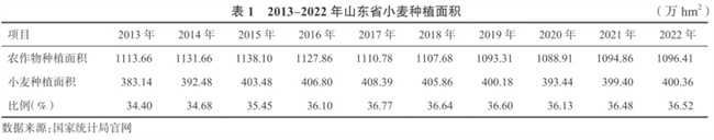 山東地處黃河中下游,位于34°23′~38°23′N,氣候資源和土壤資源豐富,非常適宜小麥生長,小麥種植面積全國第二,約占全國的14%。多年來山東小麥單產(chǎn)位居全國前列,數(shù)次打破全國冬小麥高產(chǎn)紀(jì)錄,山東省小麥生產(chǎn)的波動直接影響著全國的小麥供應(yīng)。近年來,山東省各級政府積極落實惠農(nóng)、補(bǔ)貼政策,推動撂荒農(nóng)田復(fù)耕復(fù)種,加上農(nóng)村土地流轉(zhuǎn)機(jī)制不斷健全完善,種糧大戶數(shù)量迅速增加,農(nóng)民種糧積極性不斷提高,小麥種植面積也不斷增加。據(jù)統(tǒng)計,全省小麥種植面積由2013年的383.14萬hm²增至2022年的400.36萬hm²,增加17.22萬hm²,增幅4.49%,其中2013-2015年增加迅速,2015年以后山東省小麥種植面積趨于穩(wěn)定,常年在400萬hm²左右(表1)。2022年山東省冬小麥種植面積400.36萬hm²,商品種子使用量6.8億kg,全省小麥種子市場規(guī)模達(dá)到30.63億元,居全國第1位。