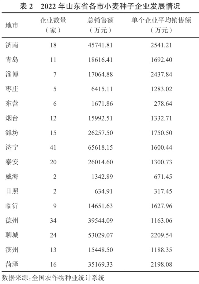 從區(qū)域分布看,企業(yè)主要集中在濟(jì)寧、德州、聊城等市,分別為41家、34家、24家(表2)。一方面,這3個市小麥種植面積廣闊,種子需求量大,種子企業(yè)發(fā)展基礎(chǔ)好,培育出了本地的規(guī)模種子企業(yè);另一方面,它們均建有多個國家級和省級小麥良種繁育基地,優(yōu)質(zhì)基地吸引重點種子企業(yè)繁種、建廠,逐漸形成種子產(chǎn)業(yè)集群。威海、日照等市耕地面積相對少、市場小,企業(yè)數(shù)量較少。從銷售情況看,濟(jì)寧、聊城、濟(jì)南總銷售額較大,分別約為6.56億元、5.30億元、4.57億元,濟(jì)南、淄博、聊城單個企業(yè)平均銷售額較高,分別為2541.21萬元,2437.84萬元、2209.54萬元(表2)。