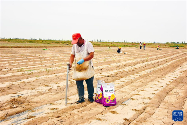 6月6日,內(nèi)蒙古巴彥淖爾市臨河區(qū)狼山鎮(zhèn)農(nóng)戶在種植向日葵。新華社記者 李云平 攝