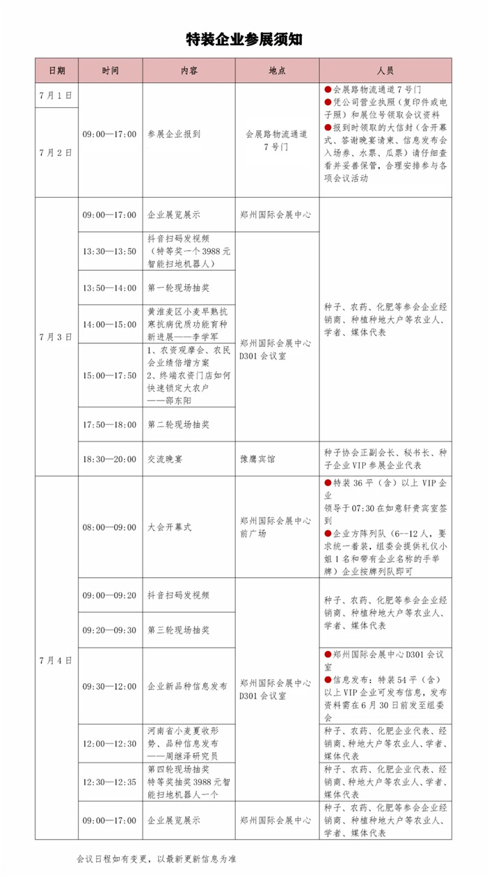 2024河南夏季種子會將于7月3-4日舉辦,展會為期二天,展商需于7月1—2日完成報到以及布展。本次大會將在鄭州國際會展中心舉辦。