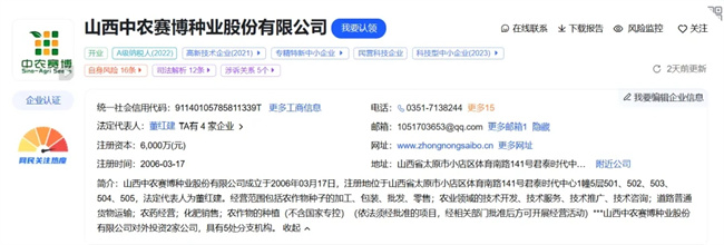 公開信息顯示,中農(nóng)賽博種業(yè)成立于2006年,注冊(cè)資本6000萬元,法定代表人為董紅建。