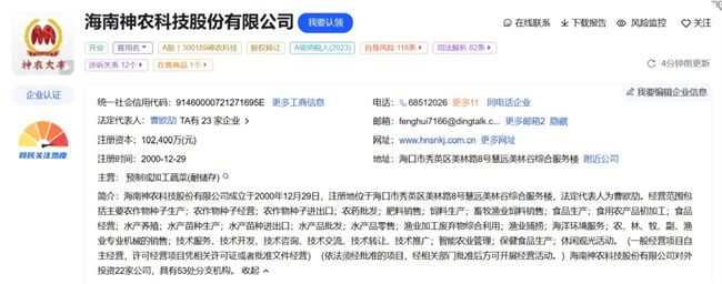 海南神農(nóng)科技股份有限公司則成立于2000年底,注冊(cè)地位于海南??冢?cè)資本10.24億元,法定代表人為曹歐劼。經(jīng)營范圍包括主要農(nóng)作物種子生產(chǎn);農(nóng)作物種子經(jīng)營;農(nóng)作物種子進(jìn)出口等等。2011年該公司在深圳交易所上市,目前市值約20.5億元。