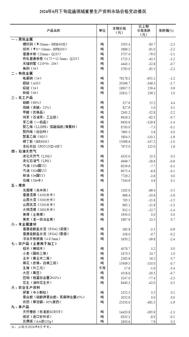 國家統(tǒng)計局?jǐn)?shù)據(jù)顯示,據(jù)對全國流通領(lǐng)域9大類50種重要生產(chǎn)資料市場價格的監(jiān)測顯示,2024年6月下旬與6月中旬相比,12種產(chǎn)品價格上漲,33種下降,5種持平。