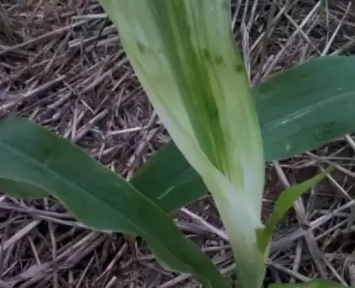 圖為玉米生長期施用莠去津不當(dāng)發(fā)生藥害癥狀▲